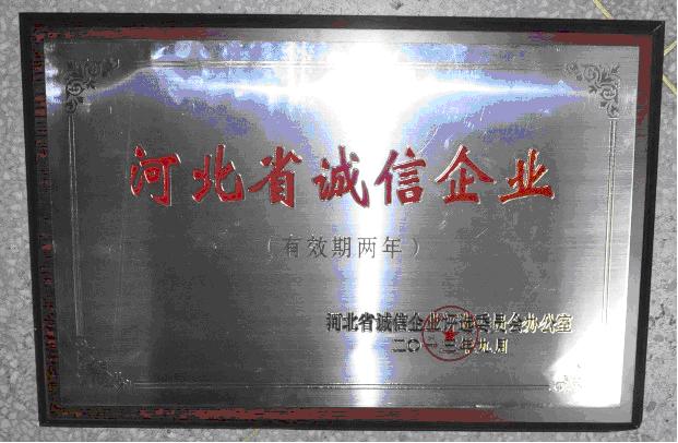 2013年9月27日,河北省誠信企業(yè)評選委員會在省會石家莊召開了2013年度誠信企業(yè)表彰大會,對榮獲2013年河北省誠信企業(yè)進行了表彰 (冀誠企評辦[2013]16號),我公司連續(xù)被評為“河北省誠信企業(yè)”。